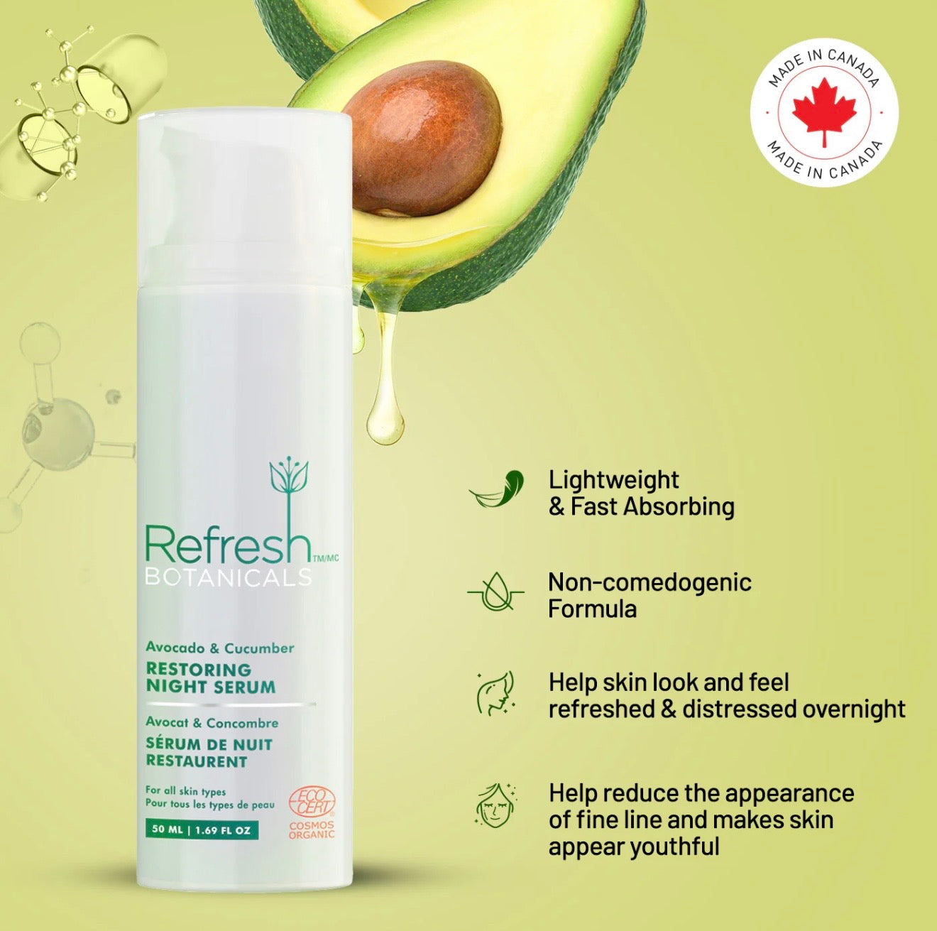 Offrez à votre peau une nuit de réparation intense avec le Sérum de nuit restaurant à l'avocat et au concombre signé Refresh Botanicals. Riche en nutriments, ce sérum luxueux hydrate profondément, renforce la barrière cutanée et ravive l'éclat naturel de la peau pendant votre sommeil. Formulé avec des huiles botaniques, des extraits végétaux puissants et des antioxydants, il aide à améliorer l'élasticité, réduire les signes de fatigue et restaurer une peau souple, ferme et éclatante au réveil.
