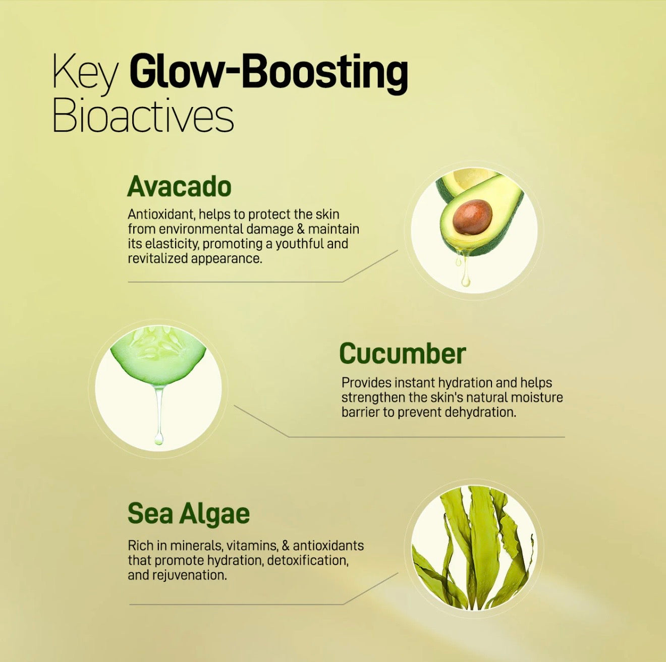 Aqua, Persea Gratissima (Avocado) Oil, Prunus Amygdalus Dulcis (Sweet Almond) Oil, Cucumis Sativus (Cucumber) Fruit Extract, Butyrospermum Parkii (Shea) Butter, Centaurea Cyanus (Cornflower) Floral Water, Glycerin, Undaria Pinnatifida (Algae) Extract, Hydrolyzed Jojoba Esters, Cetyl Alcohol, Carthamus Tinctorius (Safflower) Oleosomes, Citrullus Vulgaris (Watermelon) Fruit Extract, Lens Esculenta (Lentil) Fruit Extract, Pyrus Malus (Apple) Fruit Extract, Sodium Lactate, Sodium PCA, Cyamopsis Tetragonoloba (Guar) Gum, Xanthan Gum, Hydrolyzed Corn Protein, Olea Europaea (Olive) Leaf Extract, Cucumis Sativus Fruit Water, Tocopherol, Helianthus Annuus (Sunflower) Seed Oil.